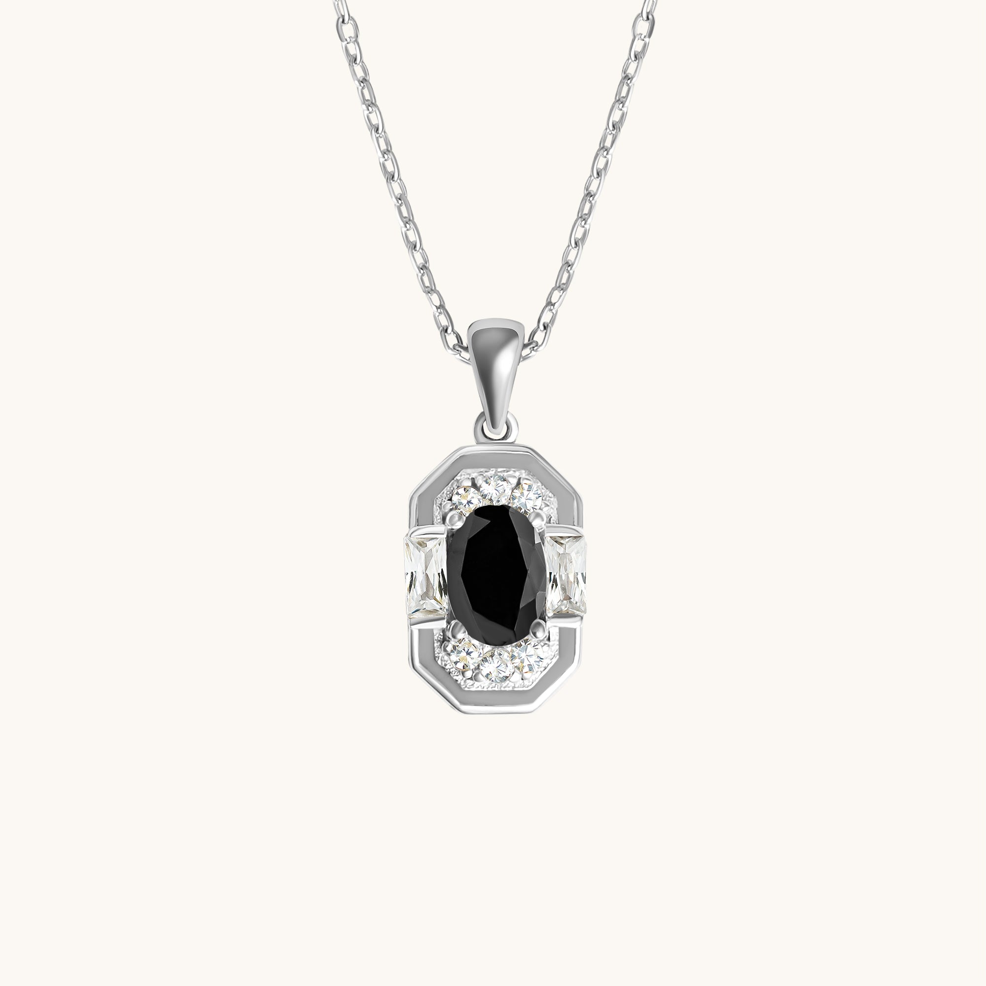 At its heart lies a striking black onyx, a gemstone revered for its grounding energy, resilience, and protection. Its deep, midnight-black hue is elegantly framed by precision-cut baguette and round zirconia stones, creating a mesmerizing contrast of light and darkness. The bold Art Deco-inspired silhouette ensures this necklace isn’t just an accessory—it’s a statement.