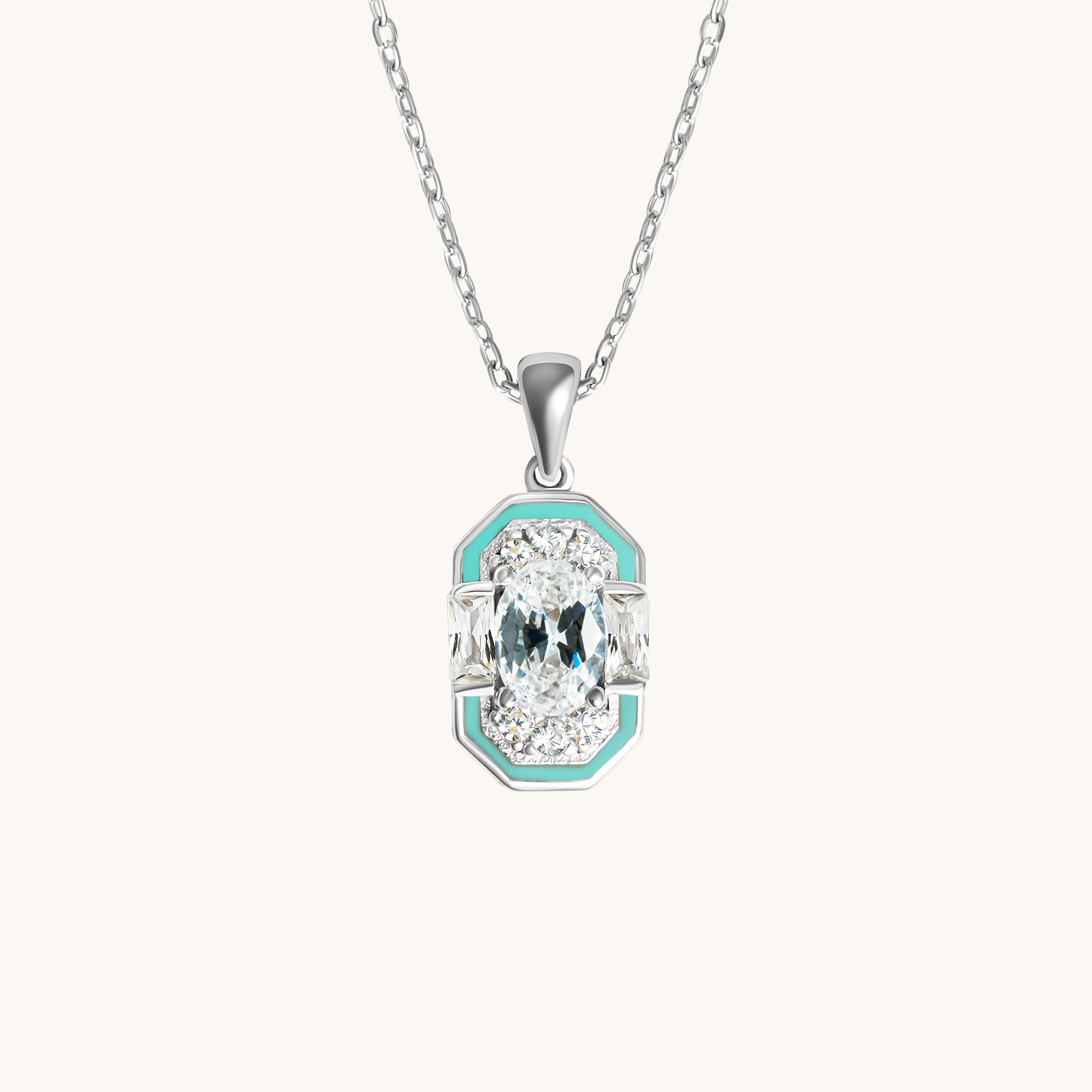 At its heart lies a serene zircon diamond, known for its tranquil blue hue—a stone of clarity, courage, and emotional balance. Framed by precision-cut baguette and round zirconia stones, the geometric Art Deco silhouette creates a striking interplay of light and shadow, ensuring it catches every eye in the room.