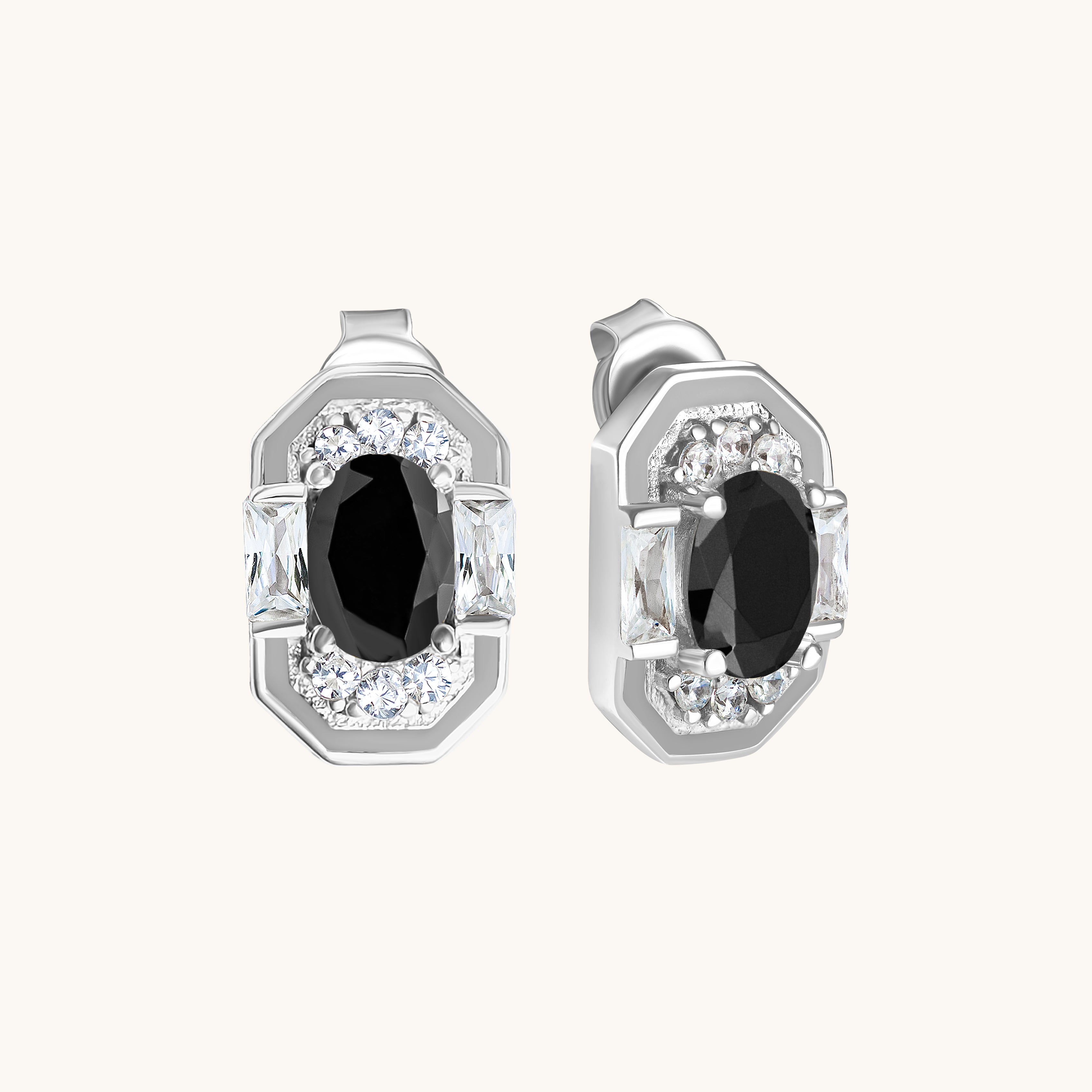 At its heart lies a striking black onyx, a gemstone revered for its grounding energy, resilience, and protection. Its deep, midnight-black hue is elegantly framed by precision-cut baguette and round zirconia stones, creating a mesmerizing contrast of light and darkness. The bold Art Deco-inspired silhouette ensures this earring isn’t just an accessory—it’s a statement.
