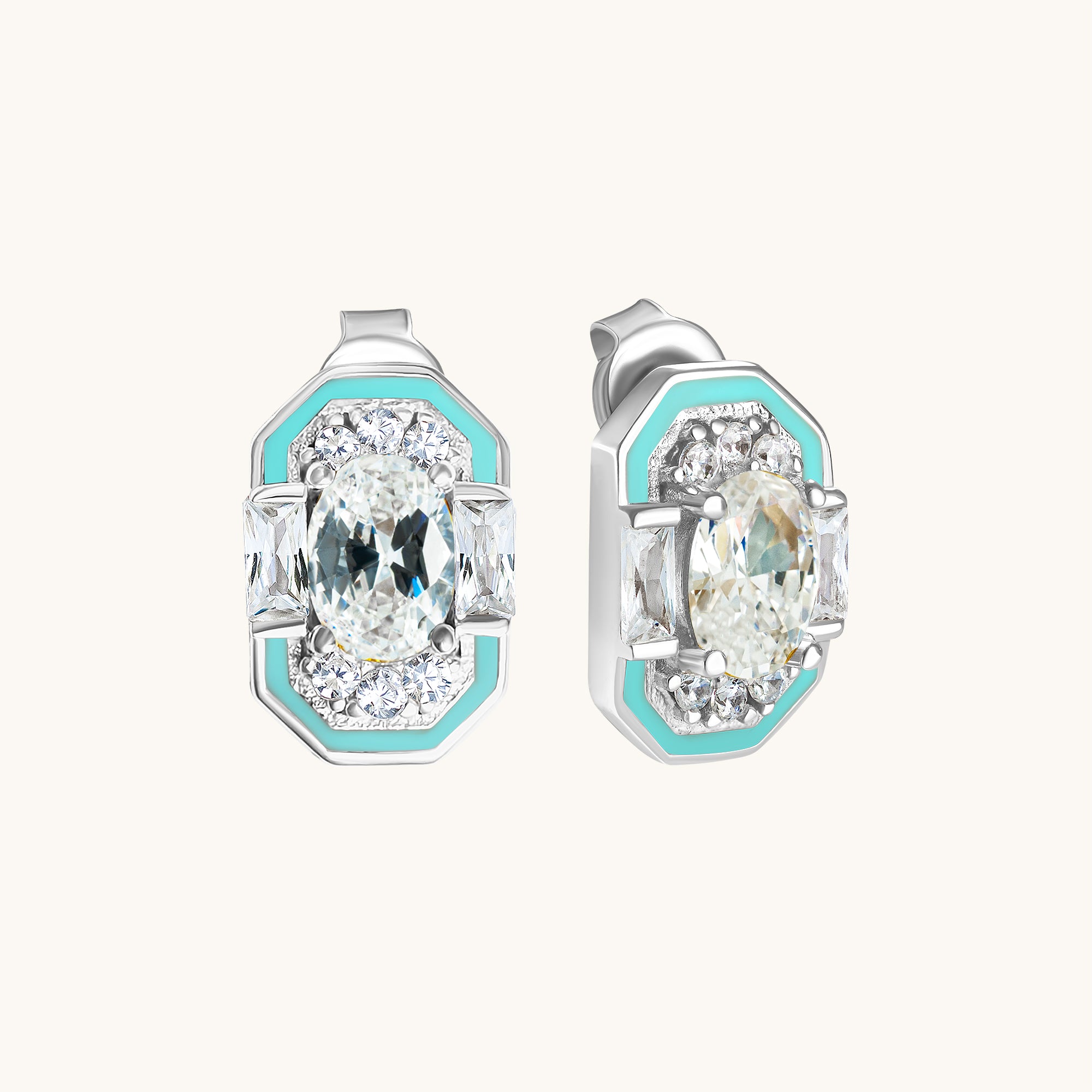 At its heart lies a serene zircon diamond, known for its tranquil blue hue—a stone of clarity, courage, and emotional balance. Framed by precision-cut baguette and round zirconia stones, the geometric Art Deco silhouette creates a striking interplay of light and shadow, ensuring it catches every eye in the room.